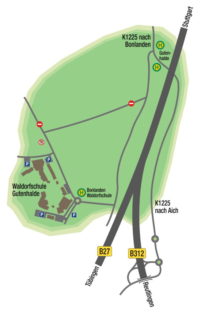 Von Stuttgart auf der B27 in Richtung Reutlingen/Tübingen. Ausfahrt Filderstadt Bonlanden-Ost. Weiter auf der K1225 in Richtung „Gutenhalde“. Nach ca. 2,5 km rechts abbiegen. „Waldorfschule“ ist ausgeschildert.