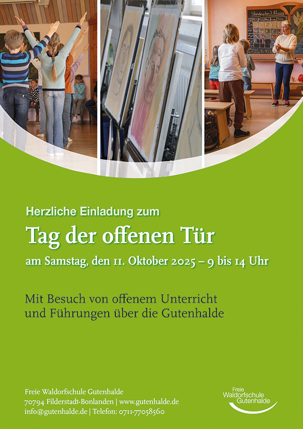 Herzliche Einladung zum Tag der offenen Tür der Freien Waldorfschule Gutenhalde am Samstag, 11. Oktober 2025. Ab 9 Uhr öffnen wir für Sie die Türen. Wir wollen Ihnen einen Einblick in die pädagogische Arbeit ermöglichen. Seien Sie unser Gast, erleben Sie wie der Schulalltag aussieht und informieren Sie sich über die verschiedenen Angebote unserer Schule.